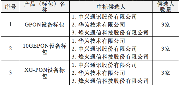 ![]() 其中,GPON设备标包、10GEPON设备标包、XG-PON设备标包皆是由中兴通讯股份有限公司、华为技术有限公司、烽火通信科技股份有限公司三家厂商共同中标。 据之前公告显示,本次招标中国电信分GPON设备、10GEPON设备和XG-PON设备三个标包,其中,GPON设备预估采购数量为OLT端口约60万、ONU(含MDU/MTU/SBU)宽窄带端口约20万;10GEPON设备预估采购量为OLT端口约45万、ONU(含MDU/MTU/SBU)宽窄带端口约20万;XG-PON设备标包预估采购量为OLT端口约4万、ONU(含MDU)宽窄带端口约5万。 |